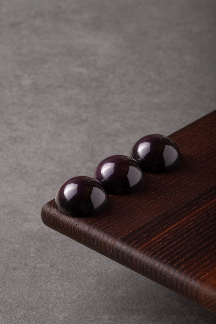Bonbon: groene dennenappel, zwarte bessenhout en gerookte hazelnoot (vegan)